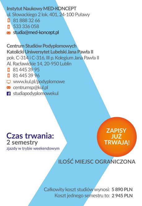 - świadectwo ukończenia studiów podyplomowych w zakresie zarządzania i monitoringu badań klinicznych, wydane przez Katolicki Uniwersytet Lubelski Jana Pawła II;